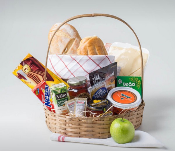 A cesta de café da manhã standard é composta por 1 bolo, 1 suco de frutas, manteiga, creme de avelã, açúcar, 1 biscoito doce, 1 torrada, 1 barra de cereal, 1 sachê de cappuccino, 1 chá, iogurte, 1 cereal e queijo. Acabamento em papel poli e fita de cetim (ou material correspondente)